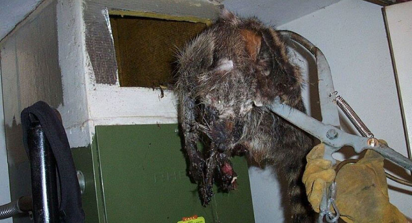 We are experts in dead animal removal, and take our job seriously. When removing dead animals, we do a COMPLETE job — not only do we remove the dead animal from your home or yard, we also decontaminate the area, deodorize it, and dispose of the animal or cremate it. If you aren't sure whether the stench in your house is due to a rotting carcass or another reason, we can sniff it out with our noses from our years of experience. We remove dead raccoons, dead opossums, dead skunks, dead squirrels, dead birds, even dead dogs and cats. We frequently remove dead rodents from inside walls, because poison kills rats and mice, who die in your house. We completely solve your dead animal problem by taking these steps: